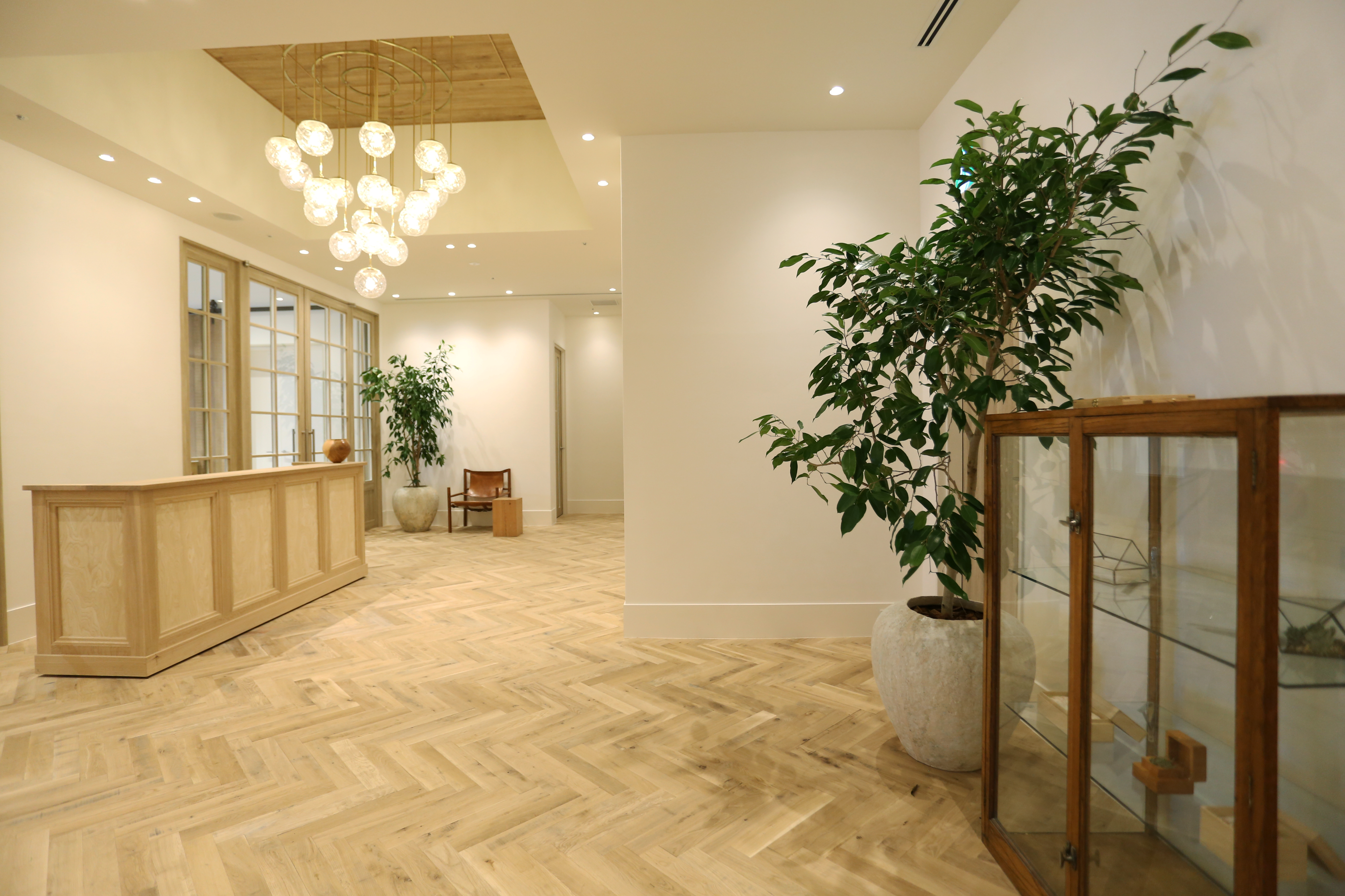 和漆喰を思わせる真っ白な白壁と木の優しい色合いが調和。装飾や演出が美しく映える、洗練された空間に仕上げています。