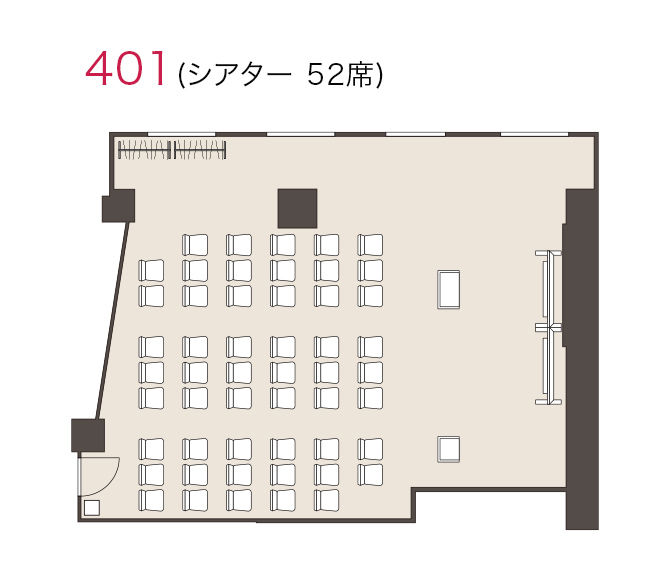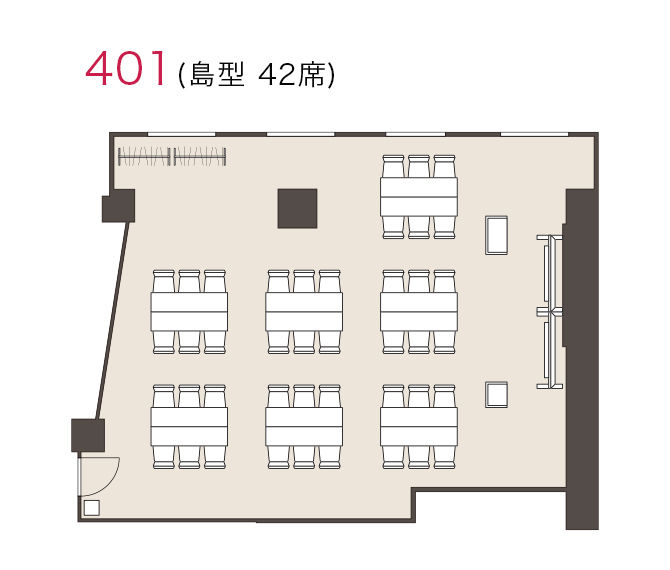 | スクール | シアター | コの字 | ロの字 | 島型 | 立食 | 正賓 | 面積(m²) | 天井高(m) | 形 | 1時間料金(円) | 時間帯料金(円) | |